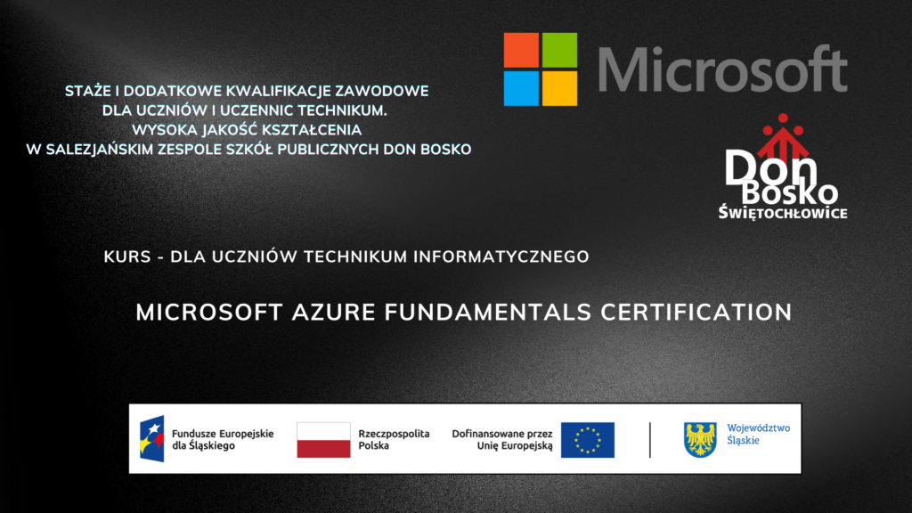 TECHNIKUM: Uczniowie naszego Technikum Informatycznego biorą udział w kursach Microsoft realizowanych w ramach projektu Fundusze Europejskie dla Śląskiego 2021-2027 (Fundusz na rzecz Sprawiedliwej Transformacji). Staże i dodatkowe kwalifikacje zawodowe dla uczniów i uczennic technikum. Wysoka jakość kształcenia w Salezjańskim Zespole Szkół Publicznych Don Bosko.